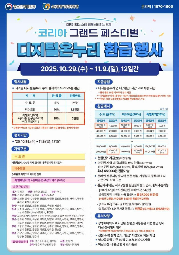 이번 ‘코리아 그랜드 페스티벌 디지털온누리상품권 환급 이벤트’의 핵심은 바로 지역별 차등 환급률로 디지털온누리 앱이나 공식 포스터에서 확인할 수 있습니다.