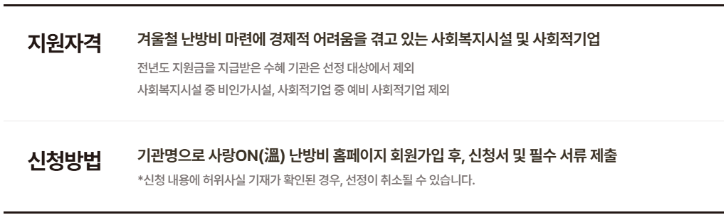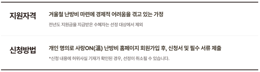 기본적인 자격은 겨울철 난방비 마련이 어려운 저소득층 가구로 개인 명의로 홈페이지 가입 후 필수 서류를 제출해야 합니다.