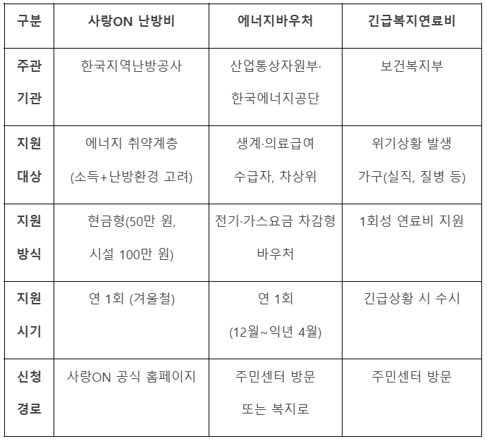 겨울철 난방비를 지원하는 제도는 사랑ON 외에도 여러 가지가 있습니다. 그중 대표적인 것이 에너지바우처, 긴급복지연료비, 지자체 에너지지원금입니다. 하지만 세부 기준과 방식에서 차이가 뚜렷합니다.