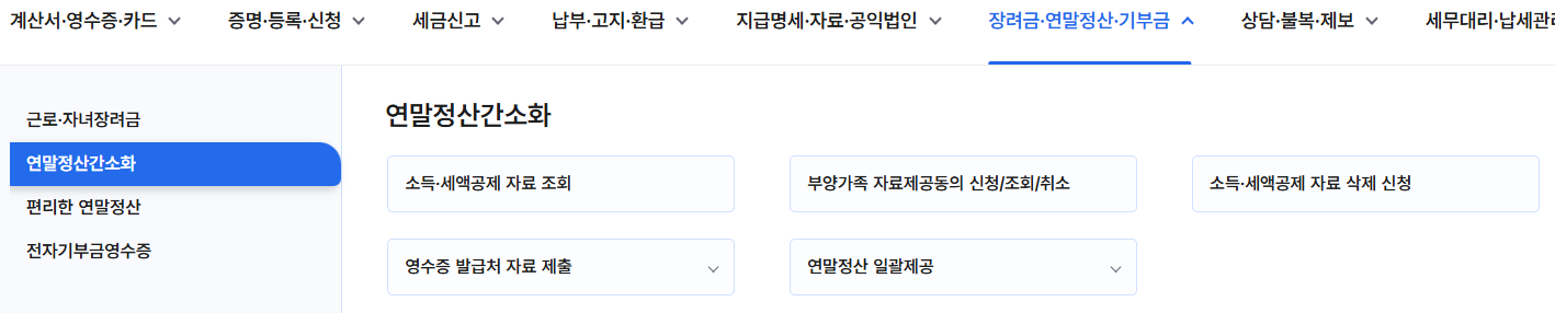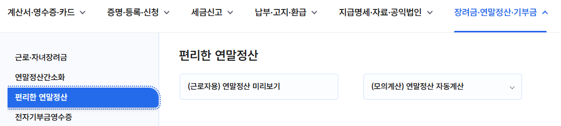 [홈택스 > 장려금 연말정산 기부금> 편리한 연말정산> (근로자용)연말정산 미리보기] 메뉴에서
