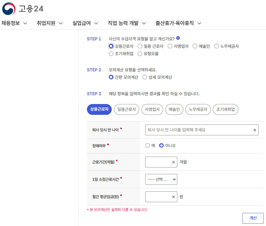 따라서 모의계산은 어디까지나 예상금액 확인용 참고 기능일 뿐이며, 실제 지급액 확인은 반드시 고용센터 상담을 거쳐야 합니다.
