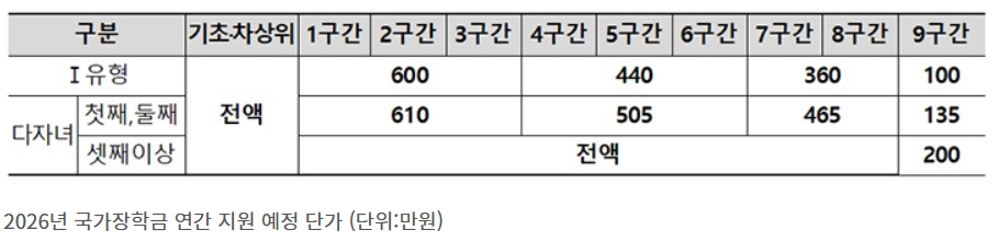 또한 2026년 국가장학금 I유형·다자녀 장학금의 연간 지원금 단가는 다음과 같습니다.